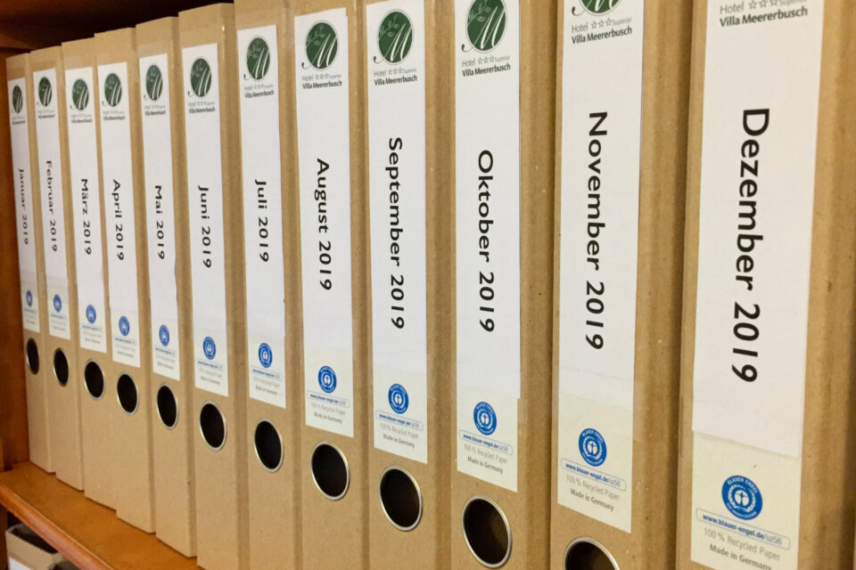 Klar, auf Papier und „verwandtes“ Büromaterial, wie zum Beispiel Ordner, können wir nicht gänzlich verzichten. Aber Sie haben die Wahl. Entscheiden Sie sich für Recycling Papier. Das ist schon lange nicht mehr traurig und grau. Sondern auf Wunsch sogar „hochweiss“, oder – noch besser und sehr zu empfehlen – „naturweiss“. Das sieht nicht nur chic und edel aus, und ist angenehmer für die Augen und zum Lesen, sondern ist auch gut für die Umwelt. Eine sehr gute, wirklich empfehlenswerte Orientierung (nicht nur für Papierwaren aller Art!) bietet das Umweltsiegel „Blauer Engel“.