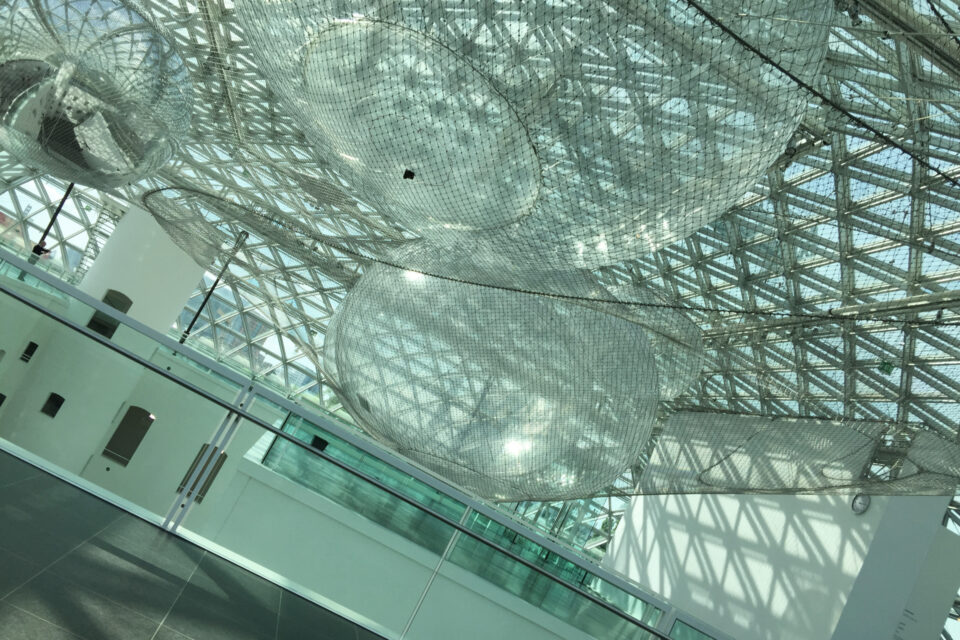 Eine wichtige Museums-Regel lautet: Bitte nicht berühren! Im K 21 sieht das ganz anders aus. Die riesige Raum-Installation, die in über 25 Metern Höhe an der Decke schwebt, ist begehbar. Genauer, der Betrachter ist dazu eingeladen, sie zu „erklettern“.Tomás Saraceno hat mit „in orbit“ eine spinnennetzartige Konstruktion entwickelt, die in drei Ebenen unter der lichthellen Glaskuppel des K21 aufgespannt ist. Fünf transparente Sphären, gewaltige Kugeln, unterstützen die „luftige“, sogar schwerelose Wirkung der Komposition.